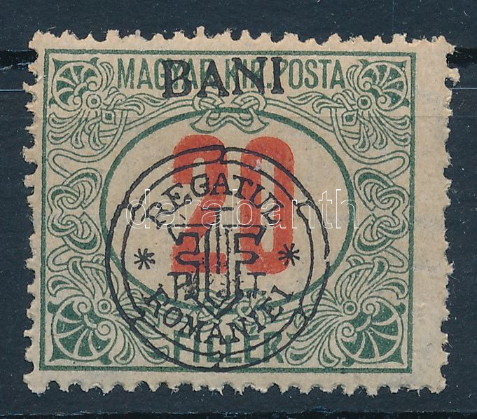 Kolozsvár 1919 Portó 20f elcsúszott felülnyomással, a BANI szó felülre került, Bodor vizsgálójellel / Mi P9 with shifted overprint. Sign: Bodor