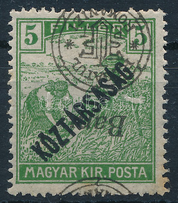 Nagyvárad 1919 Arató/Köztársaság 5f elcsúszott, fordított felülnyomással (rozsda) / Mi 53 II. with inverted overprint. Signed: Bodor (stain)