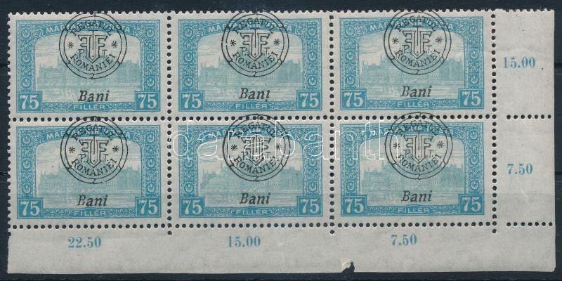 Nagyvárad 1919 Parlament 75f ívsarki 6 -os tömb, a felső középső bélyegen a Bani szóban fordított "i" betű lemezhiba, Bodor vizsgálójellel