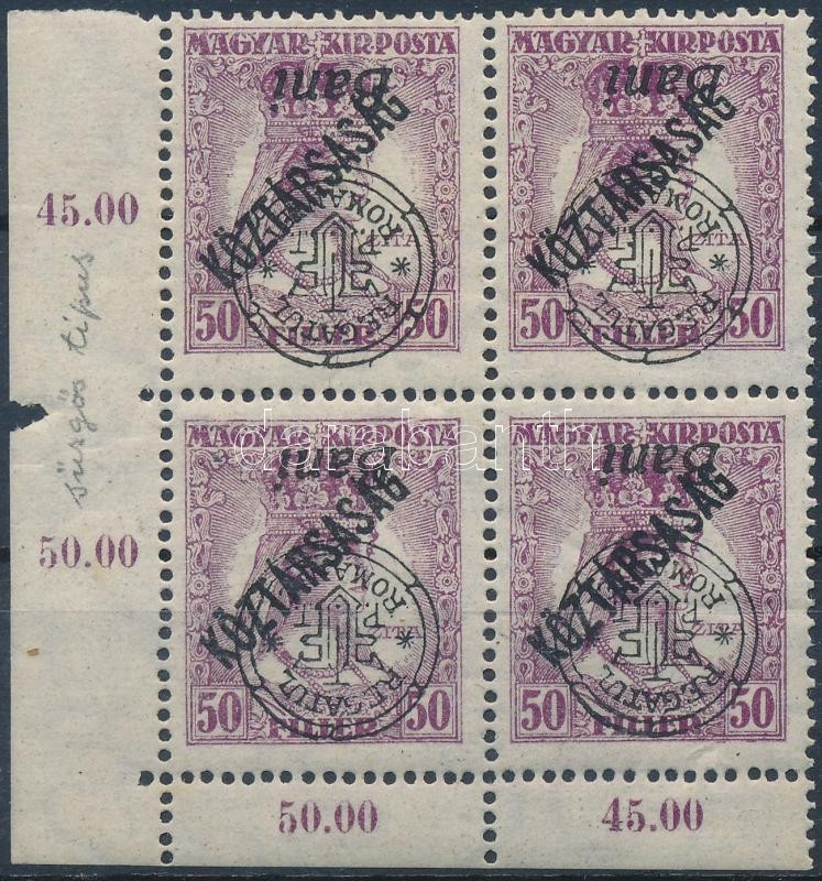 Nagyvárad 1919 Zita/Köztársaság 50f ívsarki 4-es tömbben, fordított felülnyomással "sürgős típus" (ráncok) / inverted overprint. Signed: Bodor (creases)