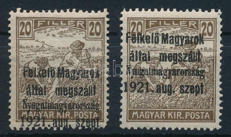Nyugat-Magyarország I. 1921 Arató 20f nagyon látványosan lefelé tolódott felülnyomással! Bodor vizsgálójellel + támpéldány