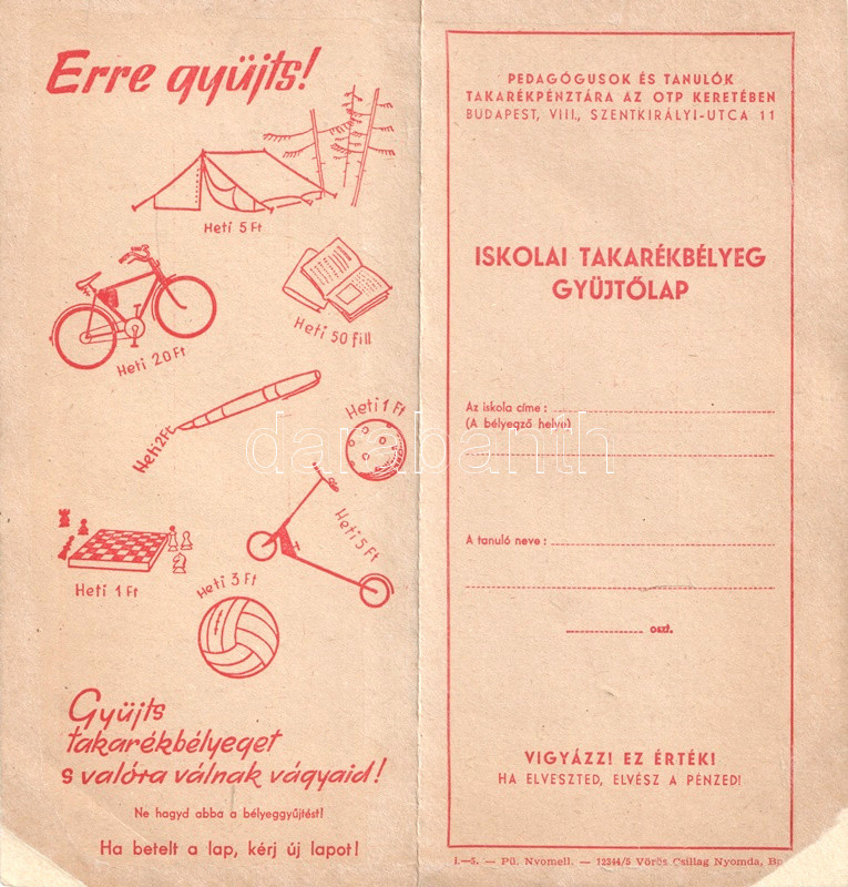 Az Országos Takarékpénztár 1953 utolsó napjaiban hozta létre új fiókszervezetét, a Pedagógusok és Tanulók Takarékpénztárát. A tanulói megtakarításokat különféle grafikájú takarékbélyegekre lehetett beváltani, kortárs visszaemlékezések szerint a takarékbélyeg-gyűjtés egyfajta versennyé vált. A takarékbélyegek felragasztására szolgáló gyűjtőívek nyomása már 1954-ben megkezdődött, és zavartalanul folytatódott egészen az 1980-as évek végéig. A korai éveiből származó gyűjtőívünk grafikákban szegény: mindössze a hátoldalra korlátozódnak a rajzok, melyeken a gyermeki takarékoskodás korabeli céltárgyai szerepelnek: könyv (heti 50 fillér takarékoskodással vehető célba), pöttyös labda (heti 1forint), sakk (heti 1 forint), töltőtoll (heti 2 forint), kézilabda (heti 3 forint), sátor (heti 5 forint), kerékpár (heti 20 forint).