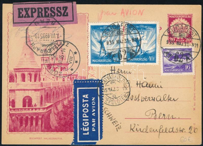 1935 Expressz légi díjjegyes díjkiegészített levelezőlap Budapestről Bernbe, Repülő posta III. bélyegekkel / Express airmail postcard