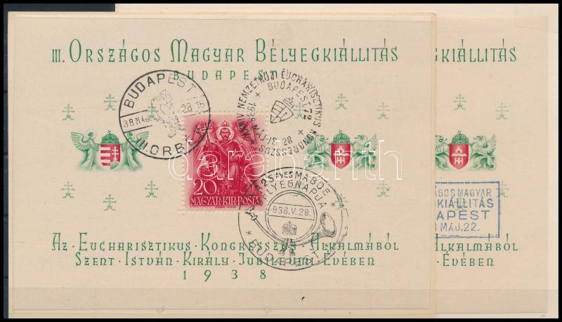 Description: 1938 2 db ORBÉK blokk, az egyik "XXXIV. NEMZETKÖZI EUCHARISZTIKUS KONGRESSZUS" és "A 25 ÉVES MABOE BÉLYEGNAP", a másik "III. ORSZÁGOS BÉLYEGKIÁLLÍTÁS" alkalmi bélyegzéssel (12.000)