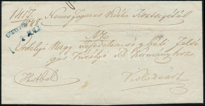 Description: 1848 Ex offo levél kék negatív "FOGARAS" bélyegzéssel Kolozsvárra. Ritkán látható ilyen minőségben!/ Ex offo cover with blue negative postmark to Kolozsvár. Rarely seen in such good condition! (Müller 850 p)
