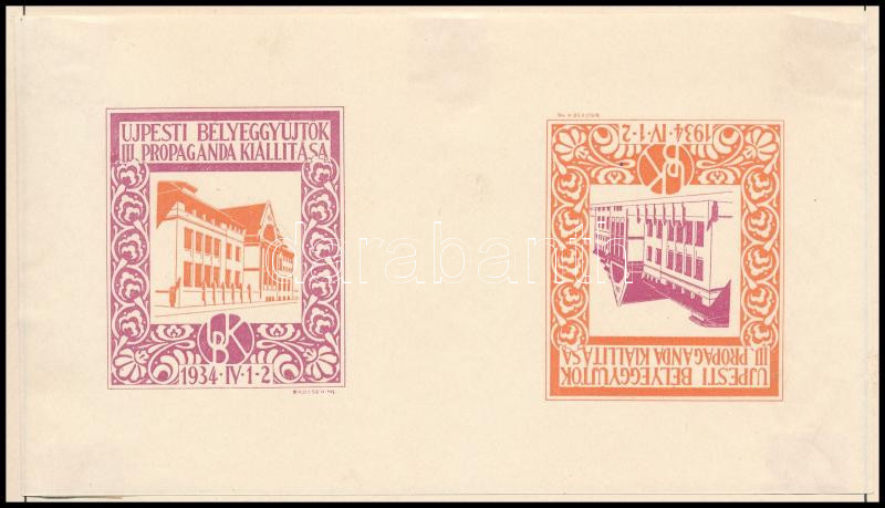 1934 Újpesti bélyeggyűjtők III. propaganda kiállítás emlékív próbanyomat összefüggő fordított párban