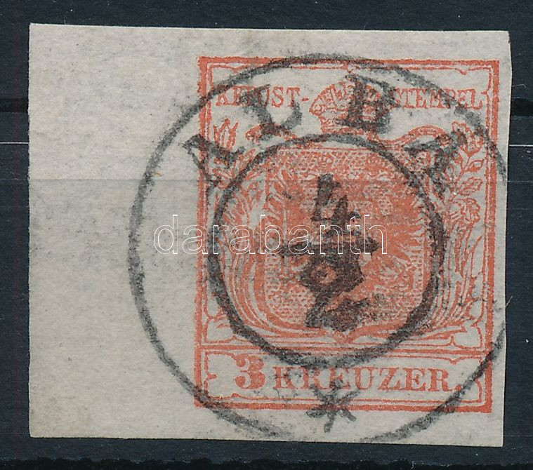 Description: 1850 3kr HP I. quadrilpapíron, 10,5 mm ívszéllel, látványos lemezhiba a bal oldali pajzsvonalnál, "ALBA". Friss, luxus darab! / Mi 3 type HP I on quadril paper with margin and plate variety. Fresh piece, luxury condition!