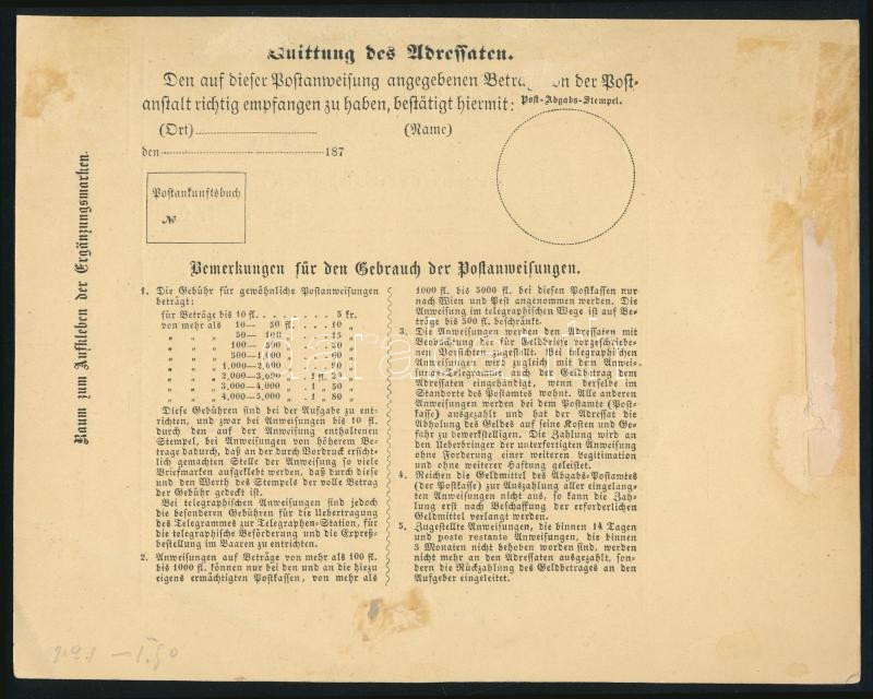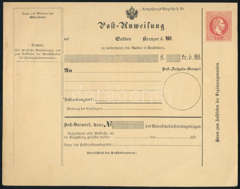 1870 Osztrák 5kr díjjegyes használatlan postautalvány, mely 1871-ben a...