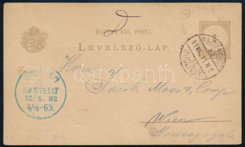 1892 2kr díjjegyes levelezőlap "M.SZIGET-MISKOLCZ" / BUDAPEST" mozgóposta bélyegzéssel Bécsbe / PS-card sent with travelling post to Vienna