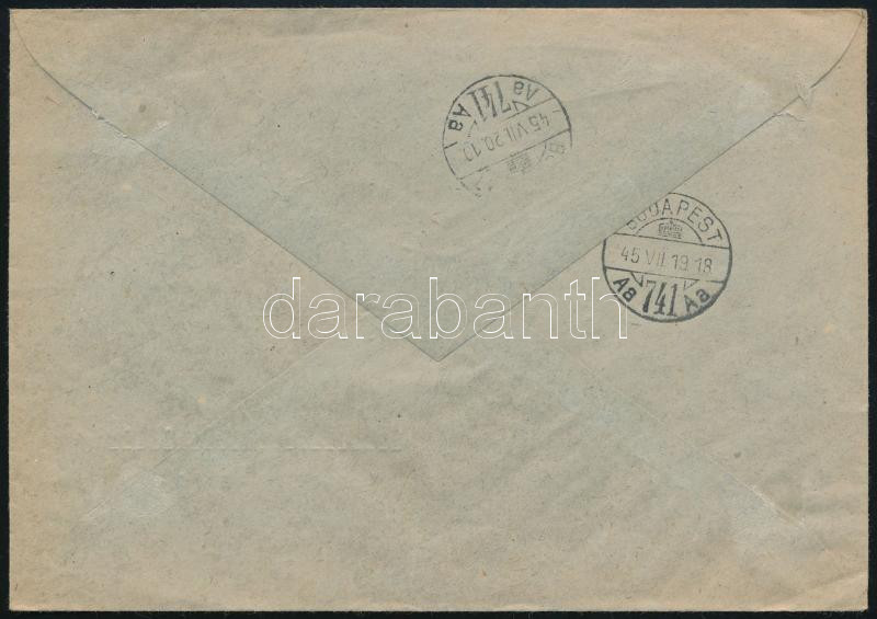 1945 (2. díjszabás) Helyi levél eltolódott felülnyomású 50f/50f négyestömbbel, továbbítva / Redirected local cover, block of 4 with shifted overprint