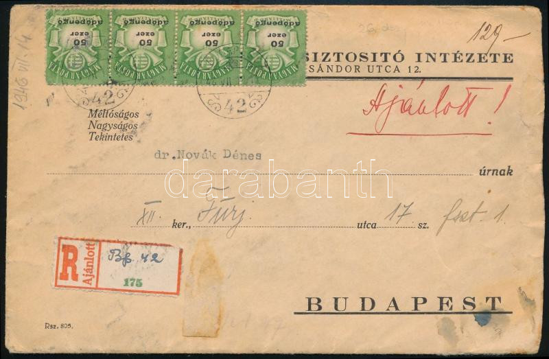 1946 (26. díjszabás) Ajánlott Budapest helyi levél 29 db Adópengő bélyeggel / Registered local cover with 29 stamps "BUDAPEST"