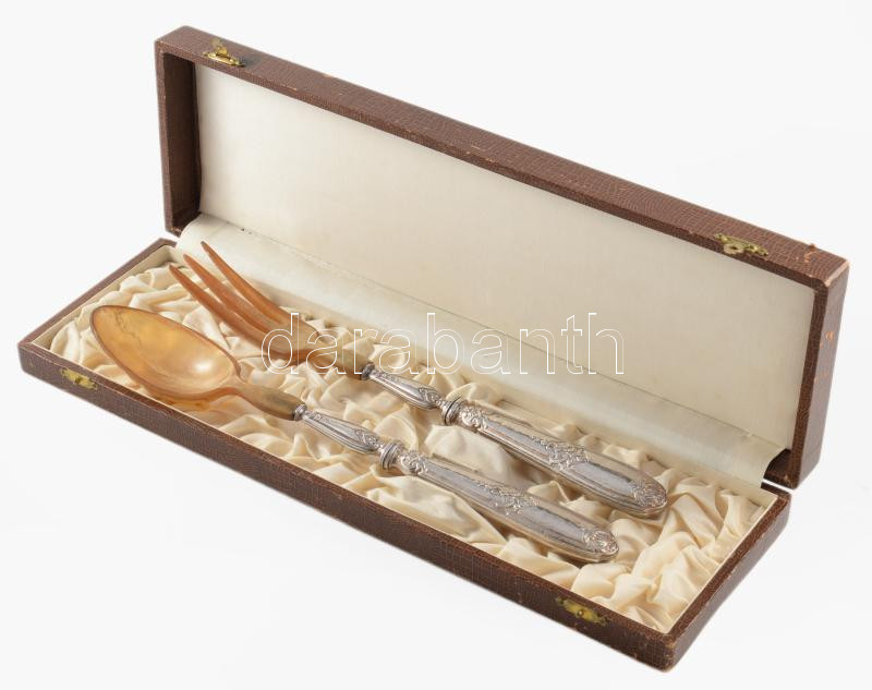 Ezüst (Ag) nyelű salátakínáló szett, dobozában, jelzés nélkül, h: 28,5 cm