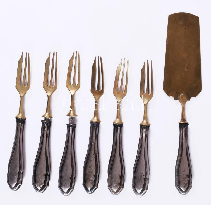 Ezüst (Ag) nyelű süteményes készlet. Dianás jelzéssel, süteményes villa 6 db, tortalapát. 16cm, 21 cm