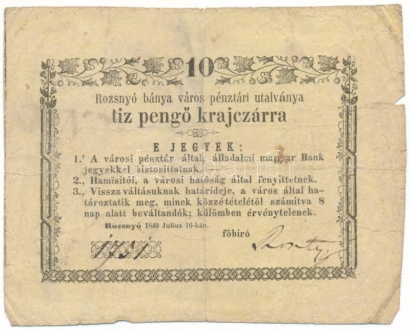 1849. július 16. Rozsnyó 10kr "Rozsnyó bánya város pénztári utalványa", 1. után a vessző feljebb van, mint a pont T:F kis szakadás