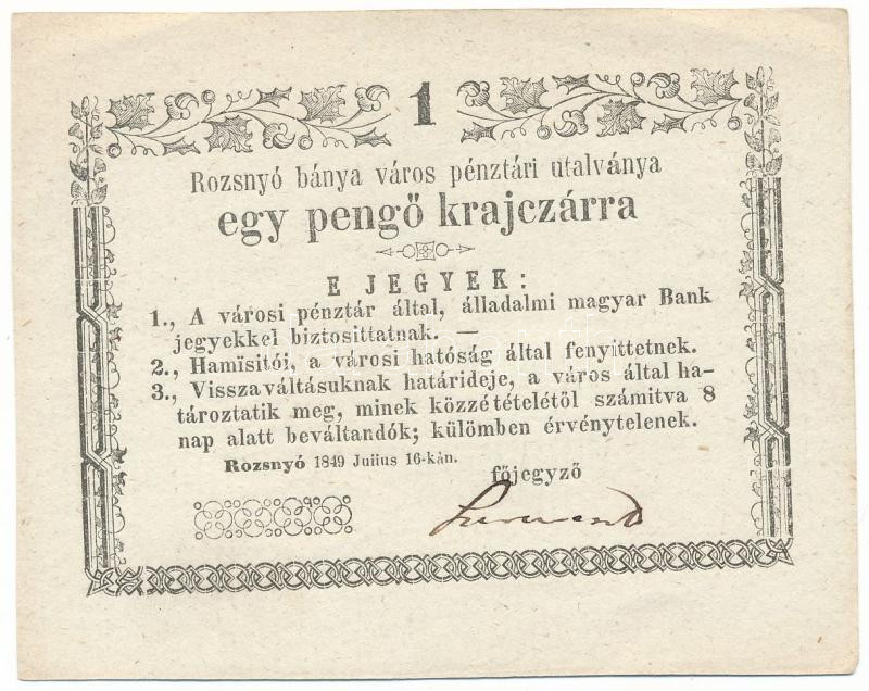 Description: 1849. július 16. Rozsnyó 1kr "Rozsnyó bánya város pénztári utalványa ", keltezésben "Juiius" sajtóhiba T:XF