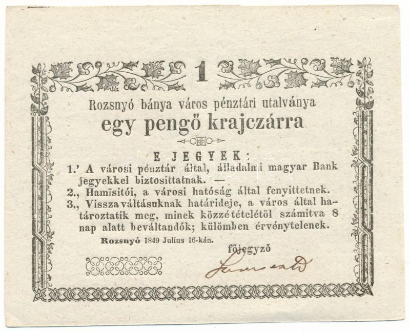 Description: 1849. július 16. Rozsnyó 1kr "Rozsnyó bánya város pénztári utalványa ", vízjeles papíron, 1. után a vessző feljebb van, mint a pont T:AU,XF