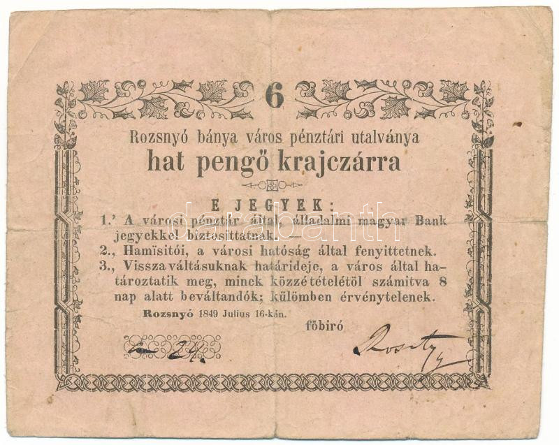 1849. július 16. Rozsnyó 6kr "Rozsnyó bánya város pénztári utalványa", rózsaszín papíron, 1. után a vessző feljebb van, mint a pont T:VG