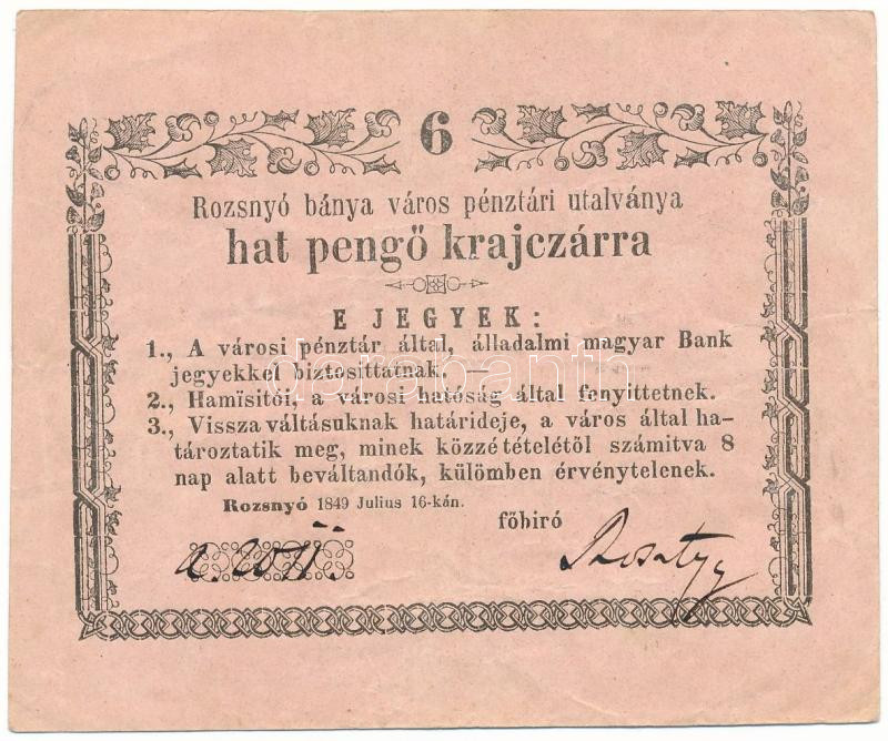 https://www.darabanth.com/en/514-Auction-philately-postcards-numismatics-artwork-books-colletibles-jewelry/515.0/Numismatics/Emergency-Coins-and-Notes~1308/1849-julius-16-Rozsnyo-6kr-3Cem3ERozsnyo-banya-varos-penztari-utalvanya3Cem3E-rozsaszin-~II3478291