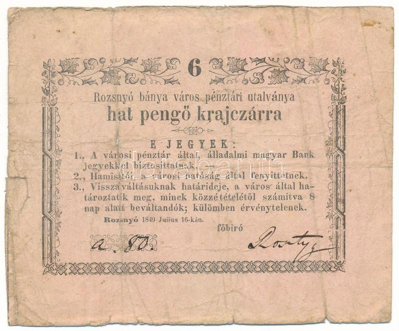 1849. július 16. Rozsnyó 6kr "Rozsnyó bánya város pénztári utalványa", rózsaszín papíron, dátumban elírás "juiius" T:VG