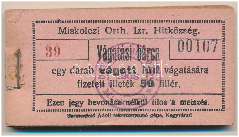 1908. Miskolc 50f "Miskolczi Orth. Izraelita Anyahitközség" vágatási jegy / értékjegy 1db vágott lúd vágatására (94x), "39 00107 - 39 00200" között T:AU, sarokhajlás