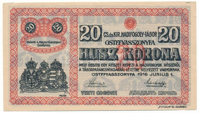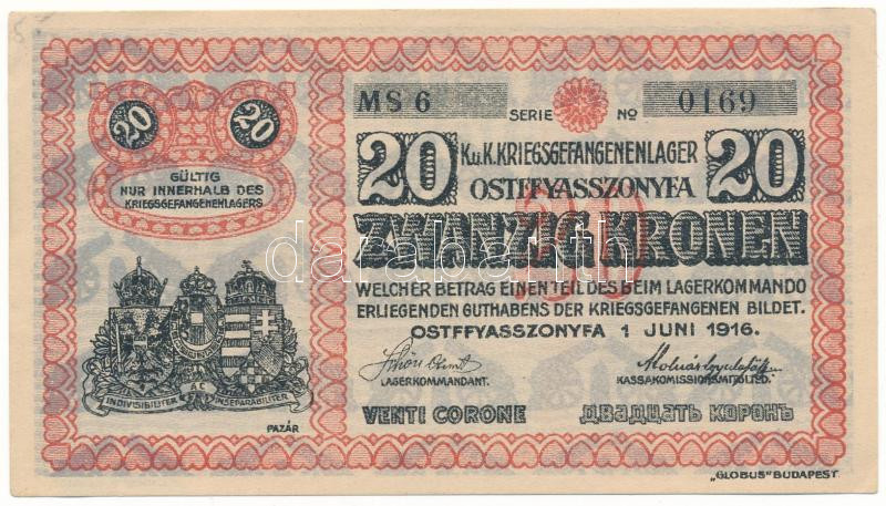 Hungary / Ostffyasszonyfa / POW Camp 1916.06.01. 20 Kronen with Arabic series- and serial number "6 0169", with "MS" prefix C:AU, folded corners