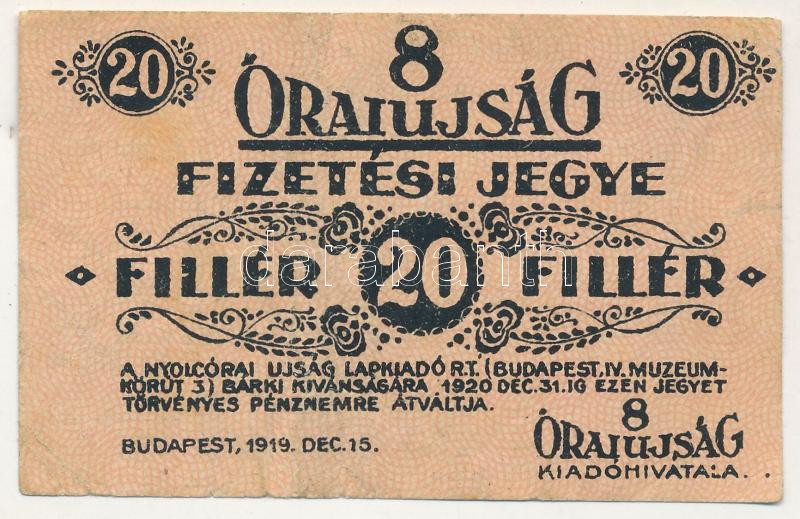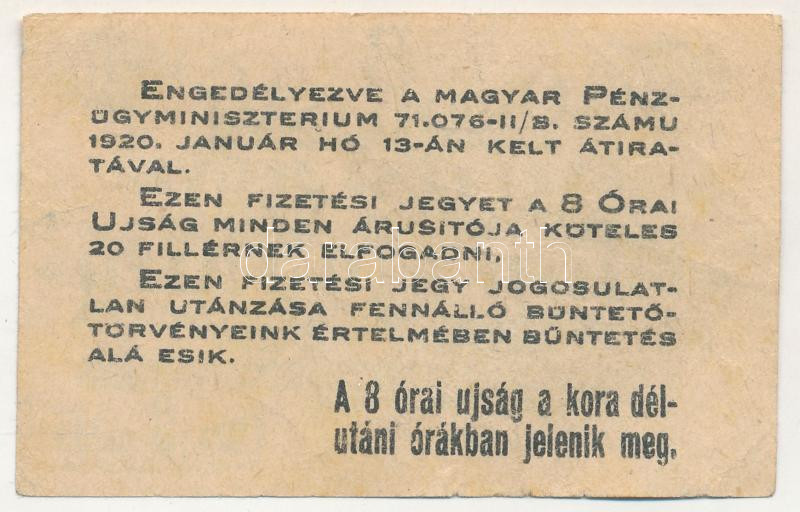 1919. Budapest 20f "8 Órai Újság fizetési jegye" T:F
