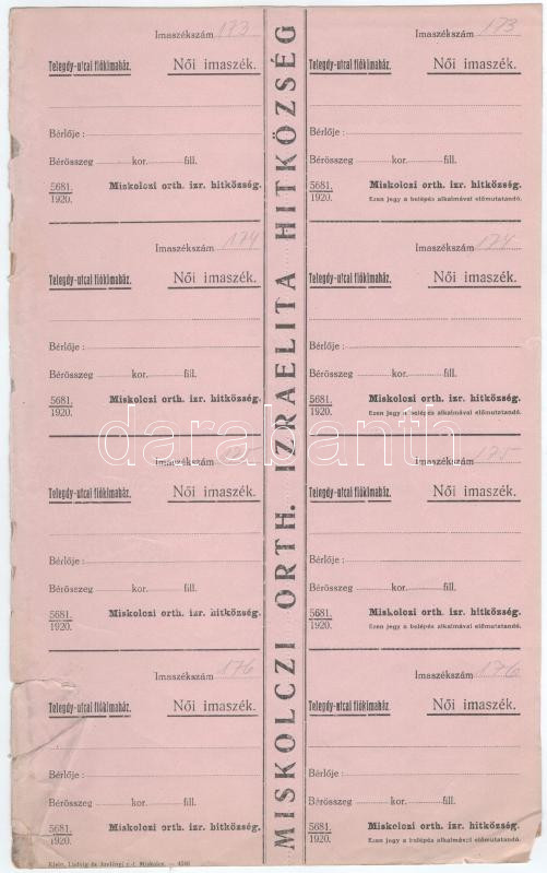 1920. Miskolc "Miskolci orth. izr. hitközség / Telegdy-utcai fiókimaház" női imaszékre szóló bárca ellenőrzőszelvénnyel, kitöltetlen de számozott, perforált ívben, ortodox izraelita hitközség (összesen 4 pár) beszakadás