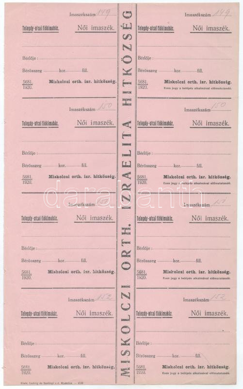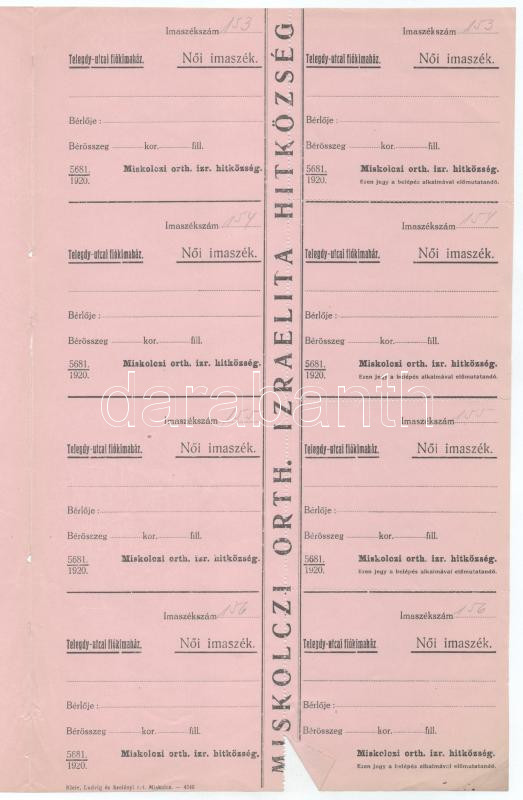 1920. "Miskolci orth. izr. hitközség / Telegdy-utcai fiókimaház" női imaszékre szóló bárca ellenőrzőszelvénnyel, kitöltetlen de számozott, perforált ívben, ortodox izraelita hitközség (összesen 8 pár) / Hungary 1920. "Orthodox Jewish Congregation of Miskolc / Telegdy Street Branch Prayer House" paper token for a women's prayer chair with a check slip, blank but numbered, in a perforated sheet, Orthodox Jewish Community (8 pairs in total)