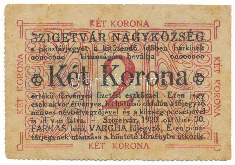 Hungary / Szigetvár 1920. 2 Korona with "SOMOGY VÁRMEGYE SZIGETVÁR KÖZSÉG" cancellation and signature C:F