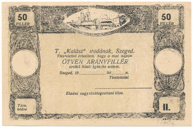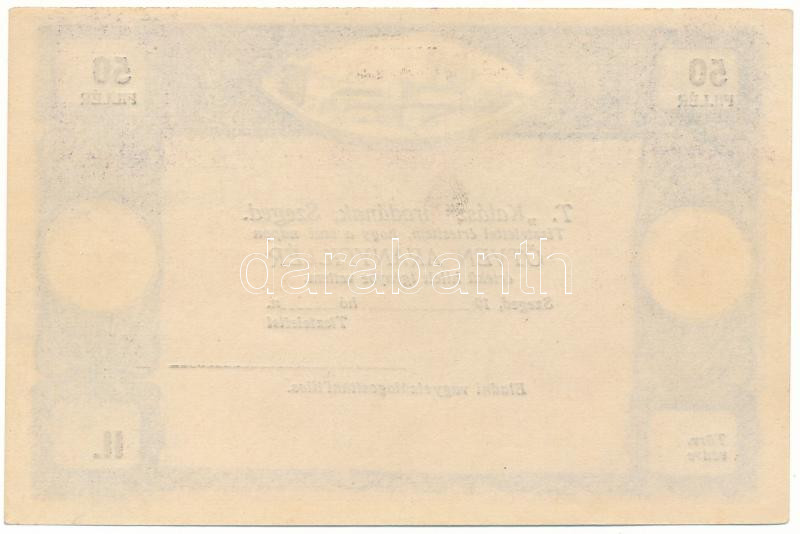 1920 k. Szeged "Kalász" 50f / 50 Aranyfillér, kitöltetlen, sorszám és bélyegzés nélkül T:AU