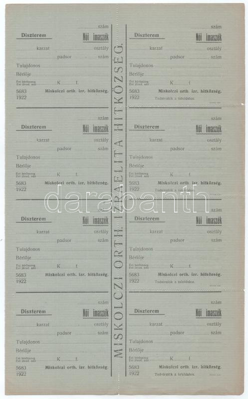 1922. "Miskolci orth. izr. hitközség / Díszterem" női imaszékre szóló bárca, kitöltetlen, ellenőrzőszelvénnyel, perforált ívben, ortodox izraelita hitközség (összesen 4 pár) / Hungary 1922. "Orthodox Jewish Congregation of Miskolc / Ceremony Hall" paper token for a women's prayer chair, blank, with a check slip, in a perforated sheet (4 pairs in total)