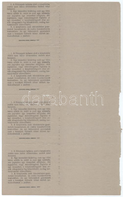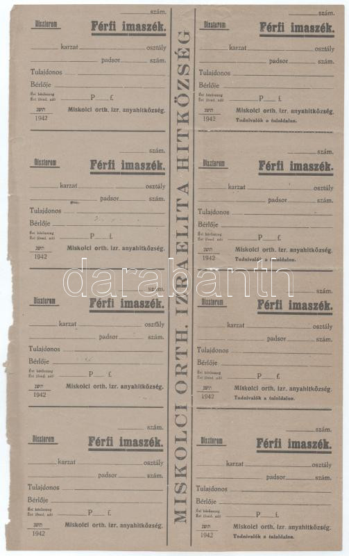 1923. "Miskolci orth. izr. hitközség / DÃszterem" férfi imaszékre szóló bárca, kitöltetlen, ellenÅ‘rzÅ‘szelvénnyel, perforált Ãvben, ortodox izraelita hitközség (összesen 4 pár) / Hungary 1923. "Orthodox Jewish Congregation of Miskolc / Ceremony Hall" paper token for a man's prayer chair, blank, with a check slip, in a perforated sheet (4 pairs in total)