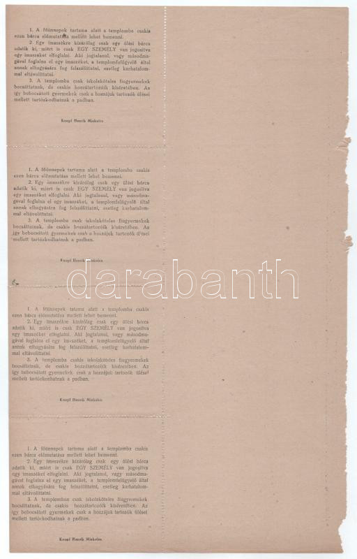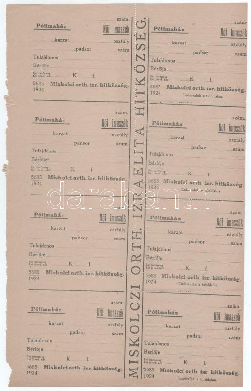 1924. "Miskolci orth. izr. hitközség / Pótimaház" női imaszékre szóló bárca, kitöltetlen, ellenőrzőszelvénnyel, perforált ívben, ortodox izraelita hitközség (összesen 4 pár) / Hungary 1924. "Orthodox Jewish Congregation of Miskolc / Alternative prayer house" paper token for a women's prayer chair, blank, with a check slip, in a perforated sheet (4 pairs in total)
