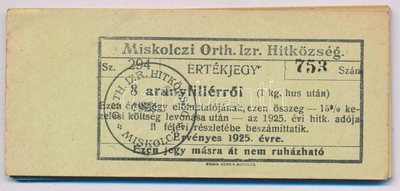 1925. 8 aranyfillérről "Miskolczi Orth. Izraelita Anyahitközség" értékjegye 1 kilogramm hús után (46x), "294 753 - 294 798" között T:XF, a tömb szétválik