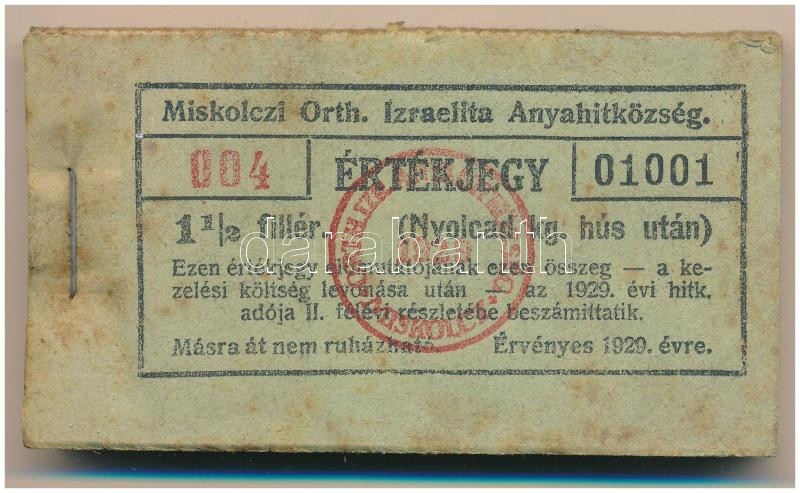 1929. Miskolc 1 1/2f "Miskolczi Orth. Izraelita Anyahitközség" vágatási jegy / értékjegy 1/8kg hús után (100x), teljes tömb "004 01001 - 004 01100" között T:AU, sarokhajlás, szennyeződés az első darabon
