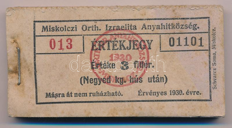 1930. Miskolc 3f "Miskolczi Orth. Izraelita Anyahitközség" vágatási jegy / értékjegy 1/4kg hús után (100x), teljes tömb "013 01101 - 013 01200" között T:AU,XF, az első darabon enyhe szennyeződés