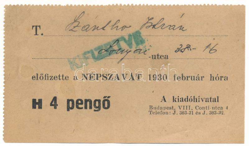 1930. "Népszava" előfizetési igazolás 4P értékben T:VF folt