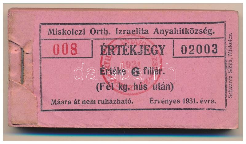 1931. Miskolc 6f "Miskolczi Orth. Izraelita Anyahitközség" vágatási jegy / értékjegy 1/2kg hús után (98x), közel teljes tömb "008 02003 - 008 02100" között T:AU, sarokhajlás