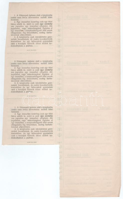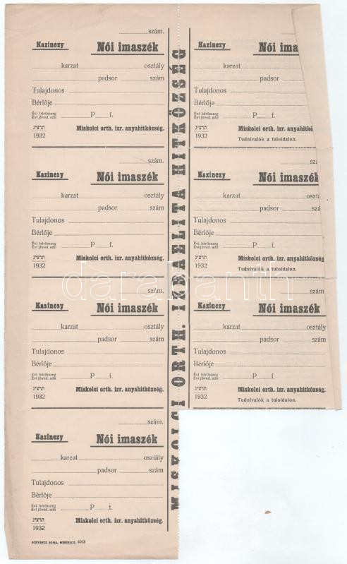 1932. Miskolc "Miskolci orth. izr. hitközség / Kazinczy" női imaszékre szóló bárca ellenőrzőszelvénnyel, kitöltetlen, perforált ívben, ortodox izraelita hitközség (összesen 3 pár + 1db ellenőrzőszelvény nélkül)