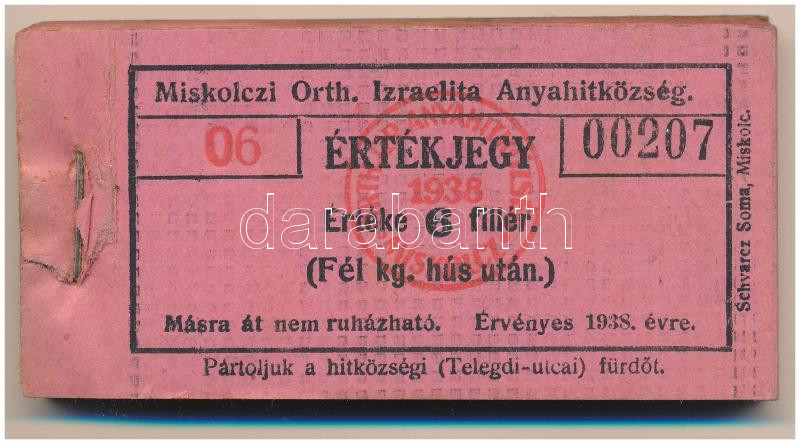 1938. Miskolc 6f "Miskolczi Orth. Izraelita Anyahitközség" vágatási jegy / értékjegy 1/2kg hús után (94x), "06 00207 - 06 00300" között T:AU, közte pár XF
