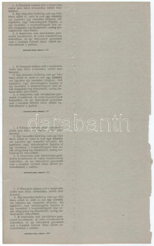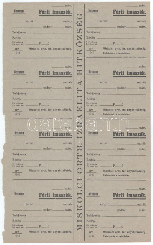 1942. Miskolc "Miskolci orth. izr. hitközség / Díszterem" férfi imaszékre szóló bárca ellenőrzőszelvénnyel, kitöltetlen, perforált ívben, ortodox izraelita hitközség (összesen 4 pár)