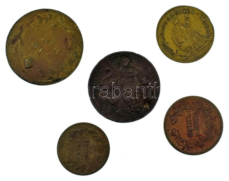 ND 5xdiff whole-shape themed Cu "SPIEL MARK" token C:XF,VF, patina