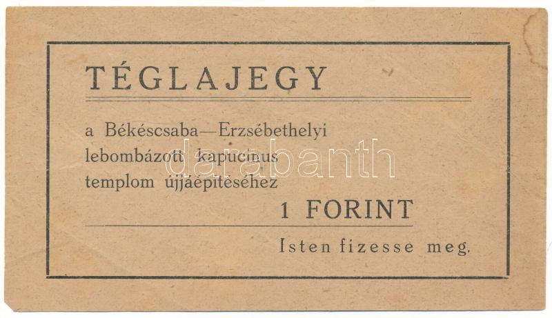 DN Békéscsaba 1Ft "A Békéscsaba-Erzsébethelyi lebombázott kapucinus templom újjáépítéséhez" téglajegy T:F