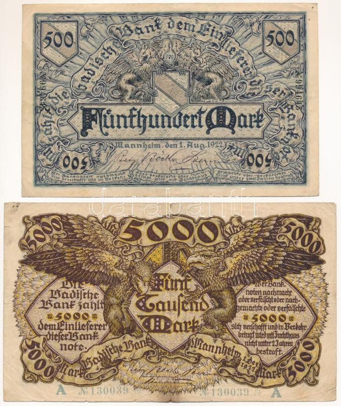Német Birodalom / Weimari Köztársaság / Mannheim / Badische Bank 1922.... https://www.darabanth.com/en/514-Auction-philately-postcards-numismatics-artwork-books-colletibles-jewelry/515.0/Numismatics/Emergency-Coins-and-Notes~1308/Nemet-Birodalom-Weimari-Koztarsasag-Mannheim-Badische-Bank-1922-500M-plus-5000M-TF-egyik-ra~II3458056