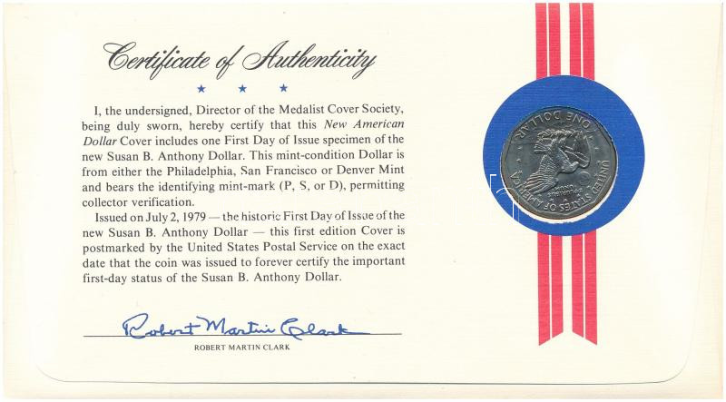 Amerikai Egyesült Államok 1979D 1$ Cu-Ni "Susan B. Anthony" felbélyegzett borítékban, bélyegzéssel T:AU