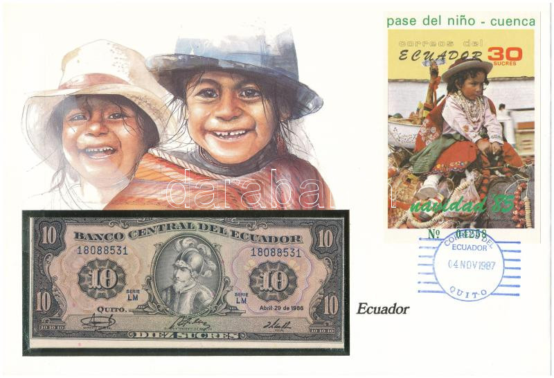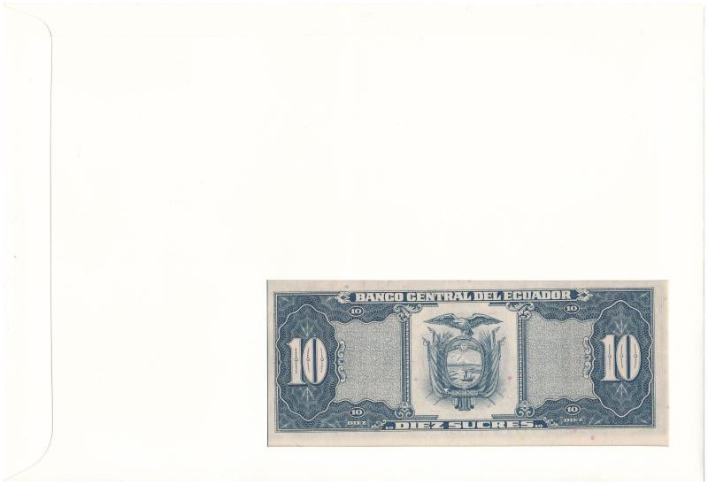 Ecuador 1986. 10 Sucres in envelope with stamp and cancellation C:UNC