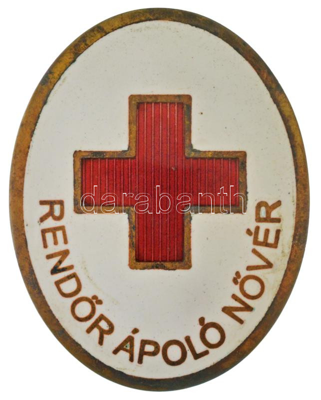 1947 k. "Rendőr ápoló nővér" zománcozott bronz jelvény, hátoldalon "Morzsányi J. Budapest Eskü út 5." gyártói jelzéssel (49x39mm) T:AU / Hungary ~1947. "Rendőr ápoló nővér (Police Nurse)" enamelled bronze badge with "Morzsányi J. Budapest Eskü út 5." maker's mark (49x39mm) C:AU