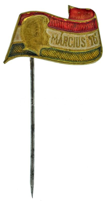 1948. "Március 15." zománcozott bronz lemezjelvény Petőfi arcképével (10x18mm) T:XF, nem eredeti tű