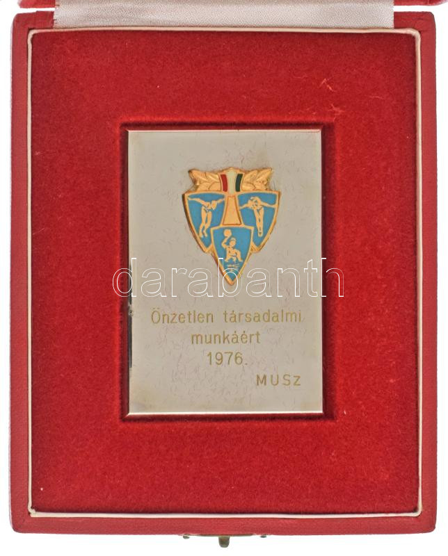 1976. "Önzetlen Társadalmi Munkáért - MUSz" zománcozott jelvény fém plaketten, eredeti tokban (52x70mm) T:XF (PP)