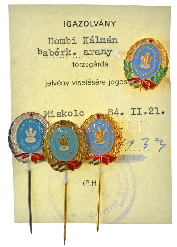 1984. "Gabonaipar" babérkoszorús aranyfokozatú törzsgárda jelvény igazolványon + 3db klf fokozat (bronz, ezüst, arany) T:AU